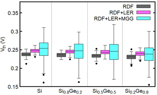Figure 7a shows the variation of for GAA NWFETs with different mole fractions of Ge and different cross-sectional shapes considering the effects of RDD, LER, and MGG. The Ge mole fraction and the shape of the cross-section do not have significant effect on variability. Regardless of the cross-sectional shapes, is smaller for the larger mole fraction of Ge, which is in a good agreement with the results in Figure 6. Additionally, it is found that the median of decreases when the cross-sectional shape is changed from ellipse to circle and to square, in this order. This trend is consistent with the dependence of on the inverse of the cross-sectional area, which increases in the aforementioned order. Therefore, the elliptical devices have smaller than the other devices (see Table 2).