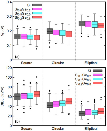 The variation of DIBL is plotted in Figure 7b. DIBL calculated from the ideal device is underestimated with respect to its median when considering variability sources (see Table 3). It is interesting to note that channel devices with larger (see Table 2) also show larger DIBL than others, regardless of the cross-sectional shape. Furthermore, the median and the variation of DIBL of the elliptical devices are smaller than that of square and circular devices.