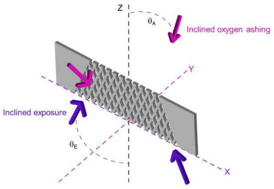Principle of inclined exposure and inclined oxygen ashing. The inclined exposure is applied from the back side of the substrate, which contains a pattern. The mesh structure on the vertical porous membrane is fabricated by inclined exposure, the angle of which is θE. The angle of inclined ashing is from a 90° to the Z axis. The inclination angle θA is determined such that etching is performed on the etched vertical porous membrane.
