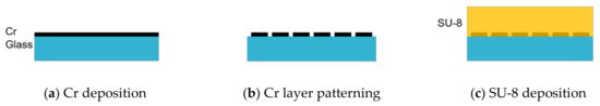 The fabrication process of the sample for evaluating the size of the vertical porous membrane is shown in Figure 2. First, a Cr layer was deposited on a glass substrate. Dot patterns were fabricated on the Cr layer by photolithography and wet etching. An SU-8 3005 (MicroChem Corp., Westborough, MA, USA.) layer was deposited by a spray coater. After removing the solvent through soft baking, the SU-8 layer was exposed twice from the back side of the substrate. After a post-exposure bake at 95 °C for 10 min, the SU-8 layer was developed. The fabricated structure was observed by scanning electron microscope (SEM, JCM-5700LV, JEOL Ltd., Tokyo, Japan).