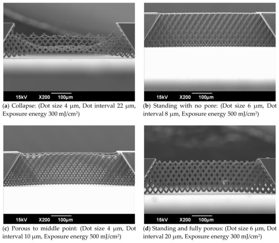 Figure 6 shows the height of the opened pore from the surface of the substrate as a function of the dot size, interval, and exposure dose. The X axis is the dot size, the Y axis is the dot interval, the Z axis is the distance from the substrate to the opened pore. The color of each point indicates the exposure dose. The blue, green, yellow, and red points correspond to 300, 400, 500, and 600 mJ/cm2, respectively. The collapsed or vertical porous membrane had no opened pore such as the structure shown in Figure 4a,b and hence is not shown in the graph. It is clear that a higher exposure energy is required for creating a higher vertical porous membrane. Meanwhile, too much exposure energy rendered closed pores.