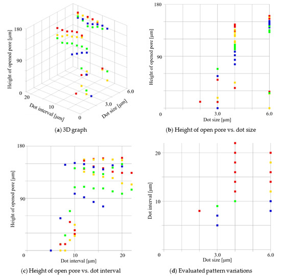 Height of the open pores from the substrate as a function of the dot size, interval, and exposure dose. The X axis is the dot size, Y axis is the dot interval, and Z axis is the distance from the substrate to the open pore. The color of each point indicates the exposure dose. The blue, green, yellow, and red points are 300, 400, 500, 600 mJ/cm2, respectively.