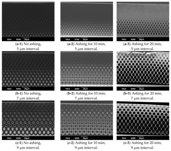 For evaluating the effect of the inclined oxygen ashing, a sample fabricated by an inclined exposure with the exposure dose of 600 mJ/cm2 was prepared. The dot size was 3 μm, and the interval was from 5 to 9 μm. The inclined ashing time was 10 or 20 min on a single side. The SEM images of the vertical porous membrane etched by inclined oxygen ashing are shown in Figure 7. Particularly, for the pores closed by the thin film on the vertical porous membrane, the dot size of 7 or 9 μm was opened by the inclined oxygen ashing. Meanwhile, the pores on the vertical porous membrane fabricated using the dot pattern of 5 μm were not opened, even after the inclined oxygen ashing. Through inclined oxygen ashing for 20 min, not only the closed pores but also the vertical porous membrane were etched and collapsed.