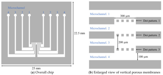 Schematics of microchannel integrated with vertical porous membranes. In the design, there are four individual microchannels. Each microchannel is connected by only the pores on the vertical porous membranes. In the vertical porous membrane, the width is 300 μm, and the interval of each vertical porous membrane is 200 μm. The dot size is 4 μm, and the interval is 10 μm for fabricating the micropores of the vertical porous membrane.