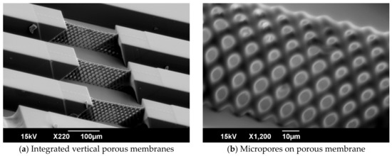 SEM images of the fabricated microchannel integrated with the vertical porous membranes are shown in Figure 9. Every micropore in the vertical porous membranes was opened, and the porous membrane did not collapse. The height of the vertical porous membrane was 79.42 μm. The maximum and minimum sizes of the micropores were 9.40 and 4.03 μm, respectively. Therefore, an integrated vertical porous membrane with height over 50 μm and pores smaller than the cell size in the microchannel was achieved.