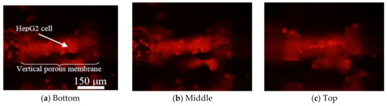 Fluorescent images of the HepG2 cells are shown in Figure 10. For observing three locations at different heights of the vertical porous membranes, three images were captured with different focal positions. The bottom is the surface of the glass substrate (Figure 10a). The middle is the center in the vertical porous membrane in the vertical direction (Figure 10b). The top is opposite to the glass substrate (Figure 10c). The HepG2 cells were observed in every focal position.