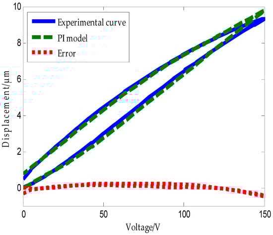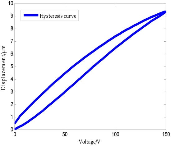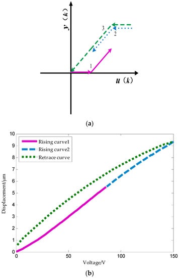 In recent years, the rapid development of ultraprecision machining technology has led to higher positioning accuracy standards of the micropositioning platform driven by some functional materials such as piezoelectric ceramics. Piezoelectric ceramics actuators (PCAs) have been widely used in precision positioning applications, such as scanning and microscopic technologies [1,2], micromanipulators [3], atomic force microscopes [4,5,6], and ultraprecision machine tools [7,8]. This is because of their ability to achieve high precision and versatility to be implemented over a wide range of applications [9]. However, the existence of hysteresis in PCAs often limits the operation performance of the actuators. Therefore, it is highly desirable to compensate for the hysteresis so that the piezoelectric devices can have a virtually linear relationship, or one-to-one mapping between the control signal and the output displacement [10]. Figure 1 presents the relationship between the displacement and the voltage across a piezoelectric actuator. It can be seen from the figure that when the voltage is applied across the piezoelectric ceramic, the step-up displacement curve does not coincide with the step-down displacement curve, and the displacement does not return to zero after the applied voltage is reduced to zero. This phenomenon is called the piezoelectric ceramic hysteresis phenomenon. This means that the actuator output displacement depends not only on the input or applied voltage at the present time, but also on the input history [11]. The intrinsic nonlinear and multivalued hysteresis in the piezoelectric actuator has the potential to cause an inaccuracy in, or even instability of, its applied system. The maximum error resulting from the hysteresis can be as much as 10–15% of the path covered [12]. It is obvious from the above analysis that the available approaches for the identification of piezoelectric-actuated stages containing the hysteresis and linear dynamics are still an open problem [13]. Therefore, establishing a precise control model of piezoelectric ceramics, and (based on this model) controlling the hysteresis nonlinearity of piezoelectric ceramics so as to improve the control precision of piezoelectric ceramics, has become a hot issue discussed by many scholars, globally [14,15].