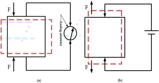 Piezoelectric effect diagram (Red dashed lines indicate after deformation): (a) Direct piezoelectric effect diagram; (b) Inverse piezoelectric effect diagram. The black rectangle represents the original shape of the piezoelectric ceramic block, and the red dashed rectangle represents the deformed shape.
