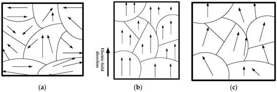 Schematic diagram of the spontaneous polarization alignment: (a) before; (b) during; (c) after presence of an electric field.