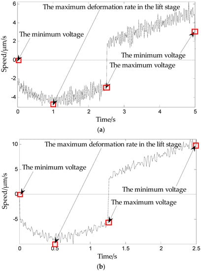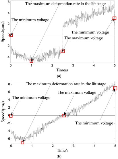As can be seen from Equations (7) and (8), α1 and α2 are electric field functions. However, the exponential function grows much faster than the power function. Therefore, the growth rate of α1 is obviously greater than the growth rate of α2, which means that the deformation rate of the piezoelectric ceramics in the range 0~Ec is greater than the deformation rate of piezoelectric ceramics in the range Ec~2Ec. In the piezoelectric deformation curve, the deformation speed of the voltage rise phase first increases and then decreases, and there is an inflection point of deformation rate. Combining this with the applied voltage period, we can determine the piezoelectric ceramic hysteresis curve inflection point voltage.