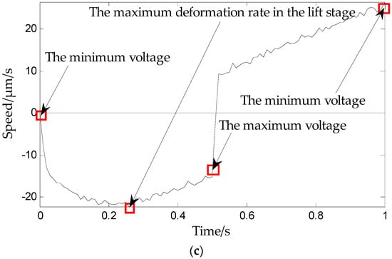 Deformation rate of piezoelectric actuators at an applied triangle wave voltage of 150 V and a frequency of (a) 0.2 Hz; (b) 0.4 Hz; (c) 1 Hz. Below the timeline, the voltage is loaded from the minimum voltage (0 V) to the maximum voltage (150 V). Above the timeline, the voltage drops from the maximum voltage (150 V) to the minimum voltage (0 V).