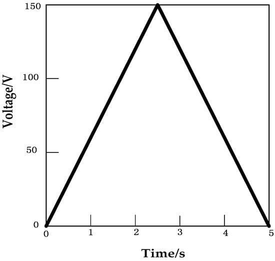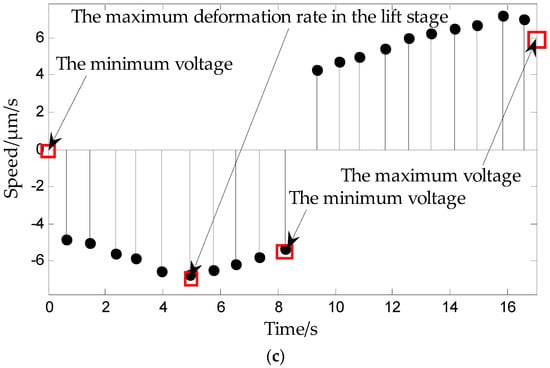 Deformation rate of piezoelectric actuators for an applied voltage of 150 V with frequency 1 Hz in (a) triangular wave form; (b) sign-wave form, u = 150(sinπt/5) positive half cycle; (c) Manually added, 0 V–150 V–0 V, at steps of 15 V. Below the timeline, the voltage is loaded from the minimum voltage (0 V) to the maximum voltage (150 V). Above the timeline, the voltage drops from the maximum voltage (150 V) to the minimum voltage (0 V).