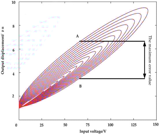 From the piezoelectric ceramic hysteresis curve shown in Figure 8, it can be seen that every time the voltage rises and reduces, a hysteresis error is introduced; however, the maximum error occurs in the main hysteresis loop (the distance from A to B in Figure 8). Therefore, in this study, we only model the main hysteresis loop of the hysteresis curve. As a next step, we will conduct a study on the remaining displacements of the hysteresis curve.
