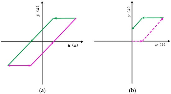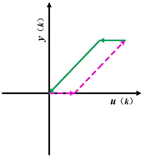 In the actual experiment, the step-down phase of the standard play operator is only partially present in the first quadrant, leading to its limited accuracy in describing the backhaul part of the hysteresis curve. The input voltage is always positive, which is increased from 0 V, therefore, in actual modeling, only a portion of the standard play operator is used. The input and output of the unilateral play operator are completely cuffed in the first quadrant, as shown in Figure 9b. The dotted and solid lines shown in Figure 9b are the output of the operator during increasing and decreasing voltage times. For u(k) ≤ r, the output y(k) always remains zero. For an input r ≤ u(k) ≤ umax, the operator output is u(k) − r. When the input voltage drops from peak umax to umax − 2r, the operator output is umax − r. After this, the operator output y(k) is u(k) + r, until the voltage drops to zero. The output of the operator whose threshold r ≥ 0.5umax does not have an output of u(k) + r.
