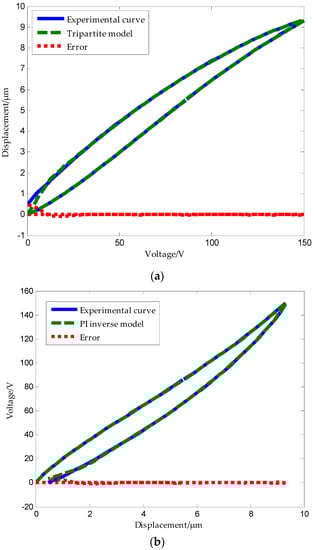The tripartite PI model and its inverse model: (a) experimental and tripartite PI model hysteresis curves of a piezoelectric ceramic actuator; (b) experimental and tripartite PI inverse model hysteresis curves of a piezoelectric ceramic actuator.