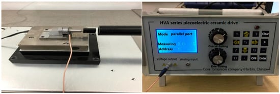 Hence, in order to verify the effect of tripartite PI inverse model on the piezoelectric ceramic driver’s hysteresis compensation, we designed a piezoelectric ceramic hysteresis model control effect comparison experiment. The PCA used for this study was the PSt150/4/7VS9 piezoelectric ceramic made by Core Tomorrow company (Harbin, China). We used the driving power HVA-150D. A3, made by Harbin Core Tomorrow Science & Technology Co., Ltd., to generate driving power (the input voltage was in the range of 0 to 150 V and the output displacement was in the range of 0 μm to 9.5 μm) to drive the piezoelectric ceramic and a Renishaw XL-80 laser interferometer to measure the displacement. The equipment used for the experiment was as shown in Figure 17. The driving power communicated with the host computer through the standard parallel port (SPP) parallel communication port. Here, we refer to the Preisach model parameters used in Song et al.’s study [16] and we used the experimental data in this study to establish the PCAs Preisach model. The desired displacement was taken as the input of the PI inverse model, the Preisach inverse model, and the tripartite PI inverse model. Thus, we got three sets of control voltages. These three sets of voltages were used to control the piezoelectric ceramic via the driving power. The output displacement was collected and recorded in real time by the laser interferometer. The control block diagram is shown in Figure 18. After the experiment, the data was processed and compared.