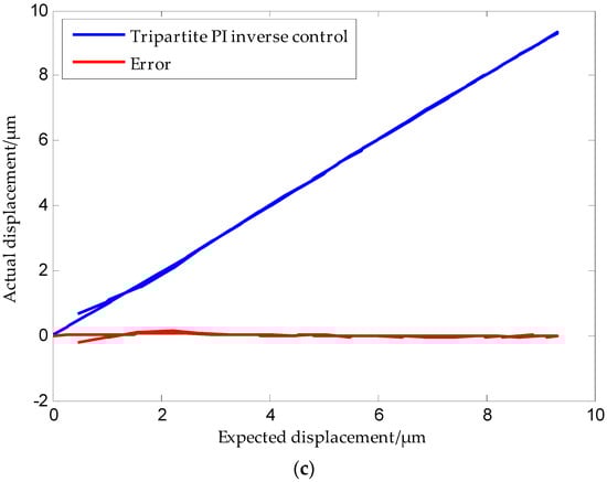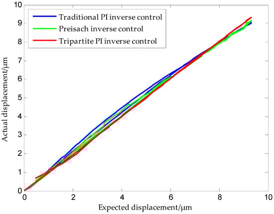 The results obtained are shown in Figure 19. The mean absolute errors (MAE) of the traditional inverse PI model, the Preisach inverse model, and the tripartite PI inverse model compensation controllers are MAE = 0.19019 μm, MAE = 0.10893 μm, and MAE = 0.03549 μm, respectively.