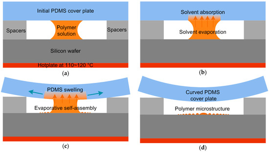 Schematic illustration of evaporating polymer solution in a flexible geometric confinement on a heated silicon wafer in the (a) initial state, (b) solvent absorption, (c) PDMS swelling, and (d) eventually curved state of the PDMS cover plate.