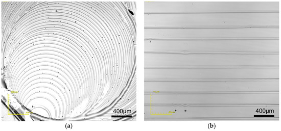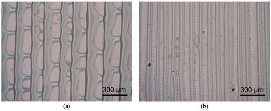 PMMA patterns obtained by evaporative self-assembly at varied gap heights of clearance: (a) 1000 μm and (b) 250 μm.