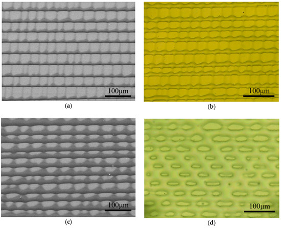 Morphologies of the PMMA microstructures. (a,c) SEM images of the as-prepared PMMA patterns obtained at varied gap heights of clearance; (b,d) optical microscope images of PMMA patterns after 200 °C annealing corresponding to (a,c), respectively.