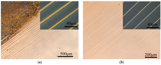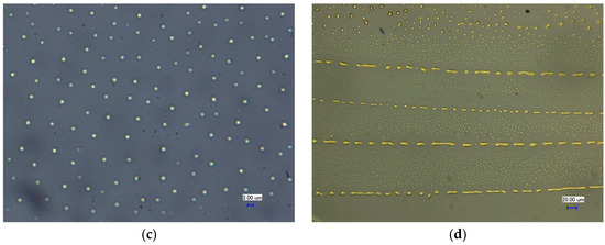 The mechanism for the facial formation of the polymer microstructure by the evaporative manner has been reported by many researchers [1,2,27,28,29]. The formation of PMMA at the vertical direction should be attributed to the coffee-ring effect. Meanwhile, the formation at the lateral direction should be due to the Marangoni effect under confined evaporation [30,31]. High temperature would lead to difference of surface tension at the liquid–air interface, and therefore drive the reflow of PMMA solution and the reshape of patterned stripes during evaporation. The stick-slip motion of the evaporating front could be helpful for the generation of the polymer patterns. There are several advantages for using high temperature to promote evaporative self-assembly formation. One of the greatest advantages is the enhancement of generation of the coffee-ring patterns under high evaporation temperature. On the other hand, a complex structure would be also obtained due to the Marangoni effect at high temperature-driven interfacial tension. The flexible geometric confinement would favor patterning polymer microstructures with various periodicities and widths.