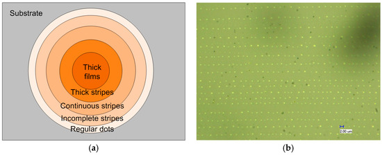 Different from the results reported by Lin et al. [1,2,12], the microstructure has various morphologies with increasing periodicities and widths simultaneously from the outmost to the center. The generation of dot-patterns should be due to the low concentration at the beginning. With solvent evaporating, the concentration at the three-phase contact line would become higher, so that the accumulation of the polymeric molecules would be increased, thus leading to a larger width. The main mechanism for formation of different morphologies in different regions can be depicted as below. The regularly distributed microdots were formed by gelation as part of the pinning-triple contact line in a rather low concentration. In contrast, the irregularly distributed microdots should be attributed to locally sputtering during receding of the evaporating front under the thermal effect. The surface tension driven Marangoni effect may also lead to the formation of the microdots by thermal re-flow [30,31].