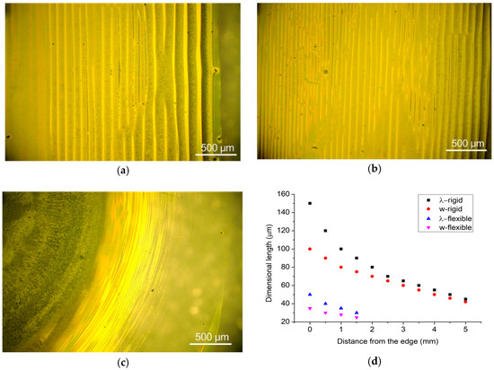 We also investigate the self-assembly of RR-P3HT with higher concentration solutions. Figure 7 compares the RR-P3HT patterns that resulted from the proposed flexible geometric confinement with that from rigid wedge-shape geometric confinement. For the former, straight dense gradient stripes were obtained (Figure 7a,b). For the latter, thick films would be found in the middle region, while finer dense gradient stripes surround the thick film (Figure 7c). The variation of periodicities and widths for RR-P3HT patterns was also demonstrated in Figure 7d. In comparison with the rigid glass-slide cover plate, the flexible PDMS cover plate would form a curve shape via solvent swelling which would attract most of the solution to the middle part, leaving a small amount for the surrounding area, thus leading to a shorter range of stripe pattern.