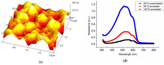 Nanostructure can be also characterized with atom force microscope (AFM), depicting that the RR-P3HT microstructure would generate nanocrystals in forms of nanofibrils (Figure 8a) or nanochains with alignment orientation to the microstripe (Figure 8b) after thermal annealing. Meanwhile, the absorbance spectra also show a blue shift of the peak value (Figure 8d), indicating the formation of larger amount of nanocrystals. In contrast, the nanostructure in the unannealed RR-P3HT patterns are random distributed and less crystallized due to the fast evaporation (Figure 8c).