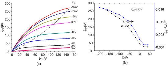 Performance of the RR-P3HT-based FET device: (a) output characteristic curve and (b) transfer characteristic curve.