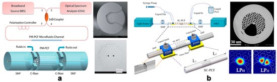 (a) Scheme and transverse section graph of the SMF-C-PCF-C-SMF microfluidic device. Reprinted with permission from []. Copyright (2014) RSC; (b) Scheme of the in-line optofluidic sensing platform and SEM image of the SC-PCF and Simulated intensity distribution of LP01 mode and LP11 mode at the wavelength of 1550 nm. Reprinted with permission from []. Copyright (2016) OSA.