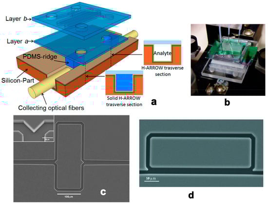 Schematic (a) and fabricated chip (b) of the sensor based on hybrid ARROW optofluidic platform. Reprinted with permission from []. Copyright (2014) OSA; (c) SEM picture of liquid-core ARROW. Reprinted with permission from []. Copyright (2010) OSA; (d) SEM picture of the integrated silicon optofluidic ring resonator. Reprinted with permission from []. Copyright (2010) AIP.