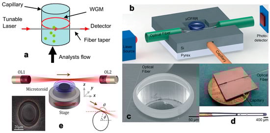 (a) The optofluidic ring resonator based on thin-walled capillary. Reprinted with permission from []. Copyright (2014) Elsevier; Schematic diagram (b), SEM image (c) and photograph (d) of the μOFRR sensor. Reprinted with permission from []. Copyright (2014) RSC; (e) Schematic diagram of the experimental setup for free-space coupling between a laser beam and a deformed toroidal microcavity. Reprinted with permission from []. Copyright (2016) OSA.