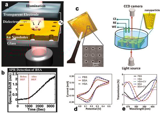 Schematic of the experimental setup for dielectrophoretic concentration of analyte molecules (a) and spectral shift of BSA’s SPR detection (b). Reprinted with permission from []. Copyright (2014) ACS; The nanoCA for electrochemical and LSPR measurement (c) and Transmission spectrum (d) of nanoCA with PBS, 100 μg/mL HSA and HSA plus CV scanning, 100 μg/mL BSA and BSA plus synchronous CV scanning and statistic (e) for shifts in dip wavelength of HSA, HSA plus CV, BSA and BSA plus CV. Reprinted with permission from []. Copyright (2015) Elsevier.
