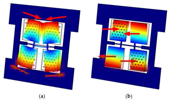 The operation modes of the butterfly vibratory gyroscope (BFVG) by COMSOL (5.2, Stockholm, Sweden). (a) The driving mode; (b) The sensing mode.