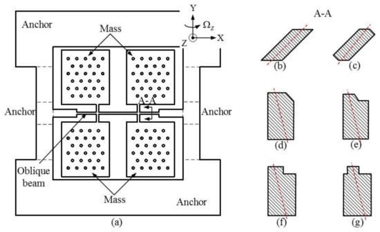 Electrostatic driving and capacitive detection are the most widely-used and successful operation modes for gyroscopes. The main types of gyroscope are the comb gyroscope and the plate capacitor gyroscope. The comb gyroscope is driven and detected by the reciprocating motion of toothed electrodes. The small electrode area is a disadvantage of this gyroscope. It cannot obtain a large signal to detect capacitance change and the fabrication process of the tooth structure is very complicated [,,,]. The plate capacitor gyroscope improves the shortcoming in the detection area. However, the ordinary plate capacitor gyroscope can only achieve in-plane displacement, and its driving and sensing electrodes should be placed vertically. This undoubtedly increases the difficulty of the design and manufacture [,,]. The butterfly vibratory gyroscope (BFVG) is classified as one kind of high sensitivity parallel plate capacitor gyroscope due to its unique structure. In addition, it has been widely-used and studied [,,]. The BFVG shows superiority in size, accuracy, operation life and performance. It measures angular velocity via capacitive sensing, where displacement arises as a result of the Coriolis Effect [,]. The performance of this devices is strongly dependent on the sensitivity of its capacitors. It is simple to manufacture with single-sided electrostatic excitation and capacitive detection [,,]. The most important part of the BFVG is the design of the oblique beam. Since the oblique beam is incline, the bending moment is generated by applying force on the plane of the BFVG. In this way, the four proof-masse can vibrate under the driving mode. The driving electrode and the sensing electrode can be made in one plane, which simplifies the fabrication process of the micro-gyroscope greatly. Also, the stability of the gyroscope is improved.