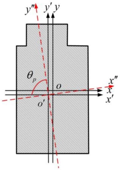 Here, we present the convex cross-section of the Sensonor Company’s (Horten, Norway) new product as an example. It is shown in Figure 3. The original axes of the rectangular cross-section are xoy and o is the center of the rectangle. When there is an unfilled corner in the rectangular cross-section, the axes deviate to x′o′y′. x″ and y″ are the inertia axes of the cross-section. The angle between x′ and y″ is the cross-section’s spindle azimuth angle. We use θp to represent it.