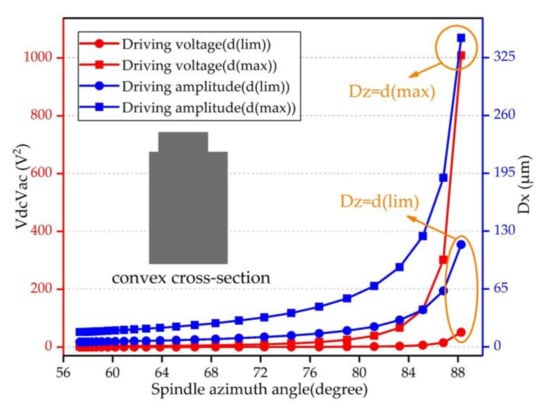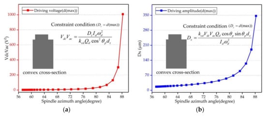 Driving voltage and driving amplitude of the convex cross-section beam, when the in-plane displacement was fixed at ; (a) shows the required driving voltages of different spindle azimuth angles; (b) shows the corresponding driving amplitudes of different spindle azimuth angles.