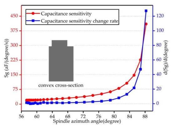 Furthermore, under the ultimate driving amplitude value in the BFVG's driving mode, the rates of capacitance sensitivity and capacitance sensitivity change for the different spindle azimuth angles were also compared and analyzed. The relation curves are shown in Figure 6; the horizontal axis of Figure 6 is the range of the gyroscope’s spindle azimuth angle. The left and right axes are the capacitance sensitivity and the change in capacitance sensitivity of the gyroscope with convex cross-section, respectively. The figure shows that, when the spindle azimuth angle ranged from 56° to 80°, the capacitance sensitivity changed slowly. When the spindle azimuth angle was bigger than 80°, the capacitance sensitivity rose perpendicularly. What is more, the change was more obvious when the angle is raised. The rate of capacitance sensitivity change also showed the same regular pattern.
