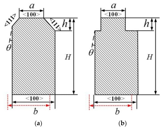 - Xiao, D.; Wang, X.; Zhou, Z.; Wu, X. A novel fabrication method based on an after thermal oxidation process for the realization of silicon-beams with normative polygon cross-sections shapes. Microsyst. Technol. 2013, 19, 1081–1086. [Google Scholar] [CrossRef]