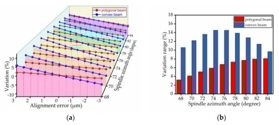 The influence of the alignment error on the spindle azimuth angle of the polygonal cross-section beam and convex cross-section beam; (a) shows the relationship between the spindle azimuth angle’s variation and the alignment error; (b) shows the range of variation—the value is the difference between the maximum and minimum value of each line.