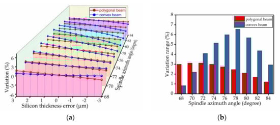The influence of the silicon thickness error on the spindle azimuth angle of the polygonal cross-section beam and convex cross-section beam; (a) shows the relationship between spindle azimuth angle variation and silicon thickness error; (b) shows the range of variation—the value is the difference between the maximum and minimum values of each line.
