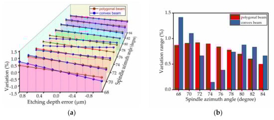 The influence of the etching depth error on the spindle azimuth angle of the polygonal cross-section beam and the convex cross-section beam; (a) shows the relationship between spindle azimuth angle variation and etching depth error; (b) shows the range of variation—the value is the difference between the maximum and minimum values of each line.