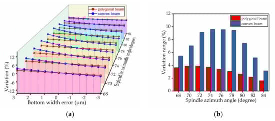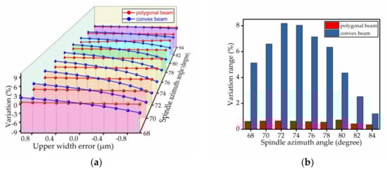 Additionally, we further analyzed the impact of the upper width error. Ordinarily, the range of the upper width error deviation is from −3 μm to +3 μm at 0.5 μm intervals. The results from the date comparison are shown in Figure 12. The influence of deviation on the polygonal cross-section beam was smaller than on the convex cross-section beam. From Figure 12b, we can see that for different spindle azimuth angles, the upper width error’s influence on the convex cross-section was far greater than on the polygonal cross-section.