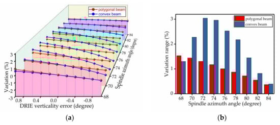Influence of the DRIE verticality error on the spindle azimuth angle of the polygonal cross-section beam and convex cross-section beam; (a) shows the relationship between spindle azimuth angle variation and DRIE verticality error; (b) shows the range of variation—the value is the difference between the maximum and minimum values of each line.