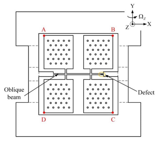The sensitive structure of the BFVG: he four points with maximum amplitude are defined as A, B, C, D, and a fabrication defect is set near the anchor on the right side; the size of the fabrication defect is 50 μm × 10 μm × 100 μm.