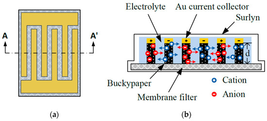 The schematic of the proposed micro-SC is shown in Figure 1. Figure 1a shows the top view of the proposed device, and Figure 1b shows a cross-sectional view. The proposed device consists of a pair of interdigital buckypaper electrodes fabricated with a typical photolithography process and vacuum filtration technique on a nylon membrane filter (MS® nylon membrane filter, Membrane Solutions Corporation, Westborough, MA, USA) with pore size of 0.8 μm. An Au film (Gold Target, Electron Microscopy Sciences Corporation, Hatfield, PA, USA) of 200 nm was deposited on the top surface of the patterned buckypaper and served as the current collector. Also, the trenches between the electrodes were filled with gel electrolyte.