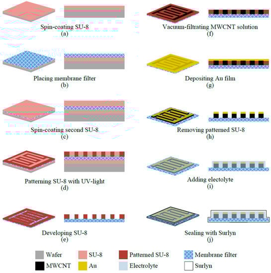 The fabrication process of the proposed micro-SC is shown in Figure 2. First, a layer of 170-μm SU-8 thick-film photoresist (SU-8 2050, MicroChem Corporation, Westborough, MA, USA) was spin-coated (20 s at 500 rpm and 50 s at 1000 rpm) onto a silicon handling wafer, as shown in Figure 2a. The model of the spin-coater was SP-01 (APISC Corporation, Taoyuan, Taiwan). Figure 2b shows how a nylon membrane filter, which served as the micro-SC’s flexible substrate, was then placed on the top of the SU-8 photoresist. Then, a second layer of 100-μm SU-8 photoresist was spin-coated (20 s at 500 rpm and 50 s at 1400 rpm) on top of the membrane filter (Figure 2c). The SU-8 layer was patterned (Figure 2d) and developed using a standard photolithography process, forming an SU-8 mold for the interdigital electrodes pair (Figure 2e). Then, CNT solution dispersed with MWCNTs (0.01 wt % concentration) was filtrated through the membrane filter with the SU-8 mold by using the vacuum filtration technique [33]; MWCNTs filled into the SU-8 mold, as shown in Figure 2f. The solution dispersed with MWCNTs was subjected to ultrasonic agitation for 120 min to reduce the CNTs’ tendency to bundle. After vacuum filtration, the MWCNT film was kept at room temperature for 120 min to evaporate residual solvent thoroughly. Then, a 200-nm Au layer, which served as the current collector, was deposited on top of the MWCNT film (Figure 2g). After removing the SU-8 mold with solvent stripper (Remover PG, MicroChem Corporation, Westborough, MA, USA) [24], the patterned interdigital buckypaper electrodes were fabricated (Figure 2h). The removal process was facilitated by the nylon membrane filter’s permeability since the solvent stripper solution easily penetrated the membrane and reached the contact interface between the SU-8 structure and the membrane.