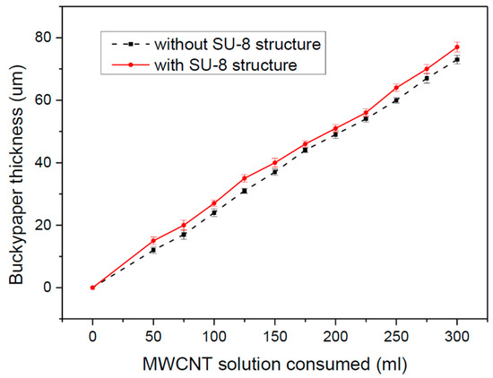 The measured relationships between the thickness of the fabricated buckypaper and the consumption of MWCNT solution is shown in Figure 3. The relationships are quite linear. This figure also compares the results of SCs fabricated using filter membranes patterned with SU-8 structures with those using filter membranes without SU-8 structures. The two curves are almost identical, which indicates the SU-8 structure does not affect the filtration’s efficiency. Note that the thickness of the SU-8 frame should be at least 20 μm greater than the buckypaper thickness to ensure successful SU-8 removal after Au film deposition.
