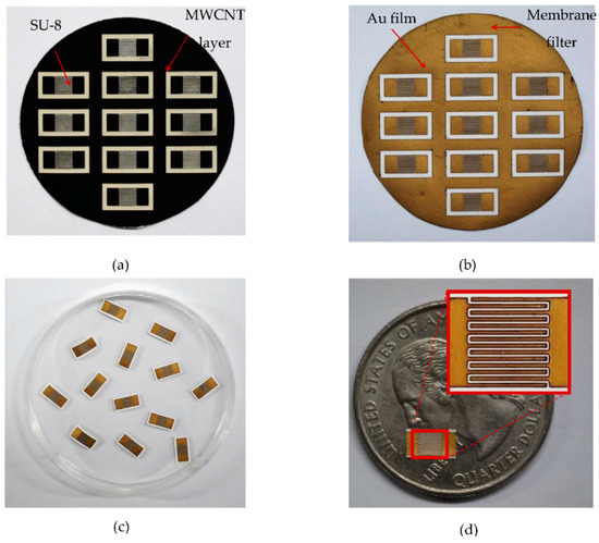 (a) The deposited MWCNT film (buckypaper) on the membrane substrate with SU-8 frame after vacuum filtration; (b) The micro-SC after depositing the Au layer and removing the SU-8 frame; (c,d) Fabricated micro-SCs before packaging.