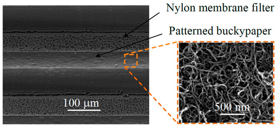 Figure 5 shows the scanning electron microscopy (SEM) images of the micro-SC (VEGA 3 SBH, TESCAN Corporation, Brno, The Czech Republic). The inset in the figure is an SEM image of higher magnification of the top surface of the patterned buckypaper. The tailored pore structures of the buckypaper, as seen under SEM, are of excellent ion accessibility.